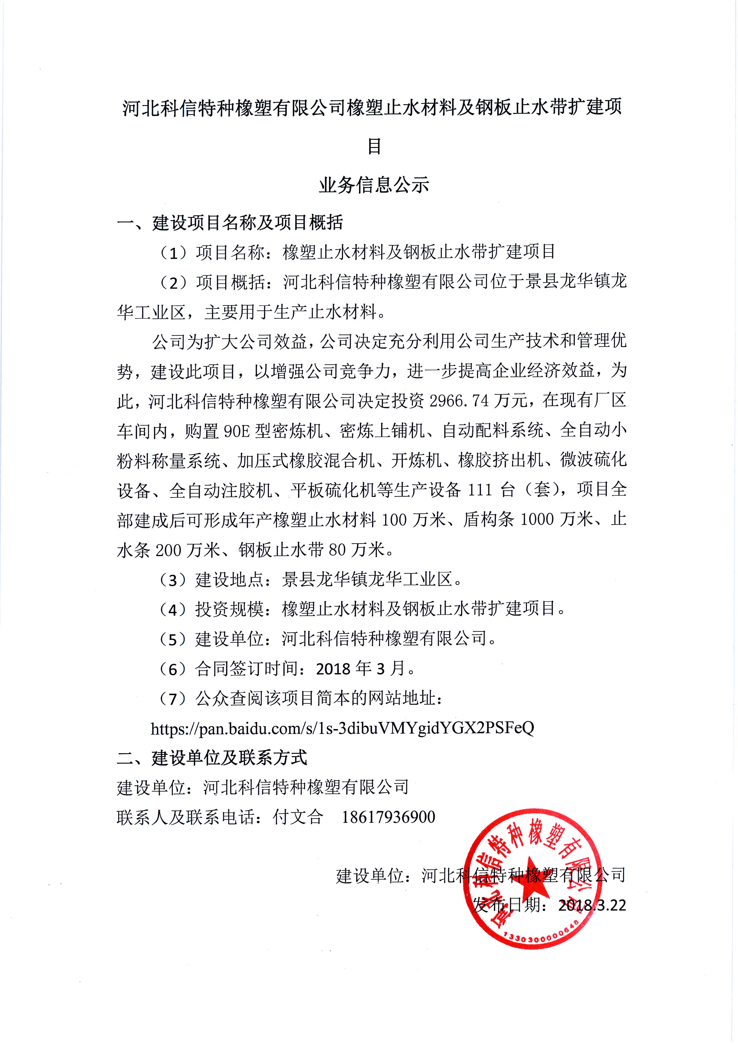 河北科信特種橡塑有限公司橡塑止水材料及鋼板止水帶擴建項目業(yè)務(wù)信息公示如下: