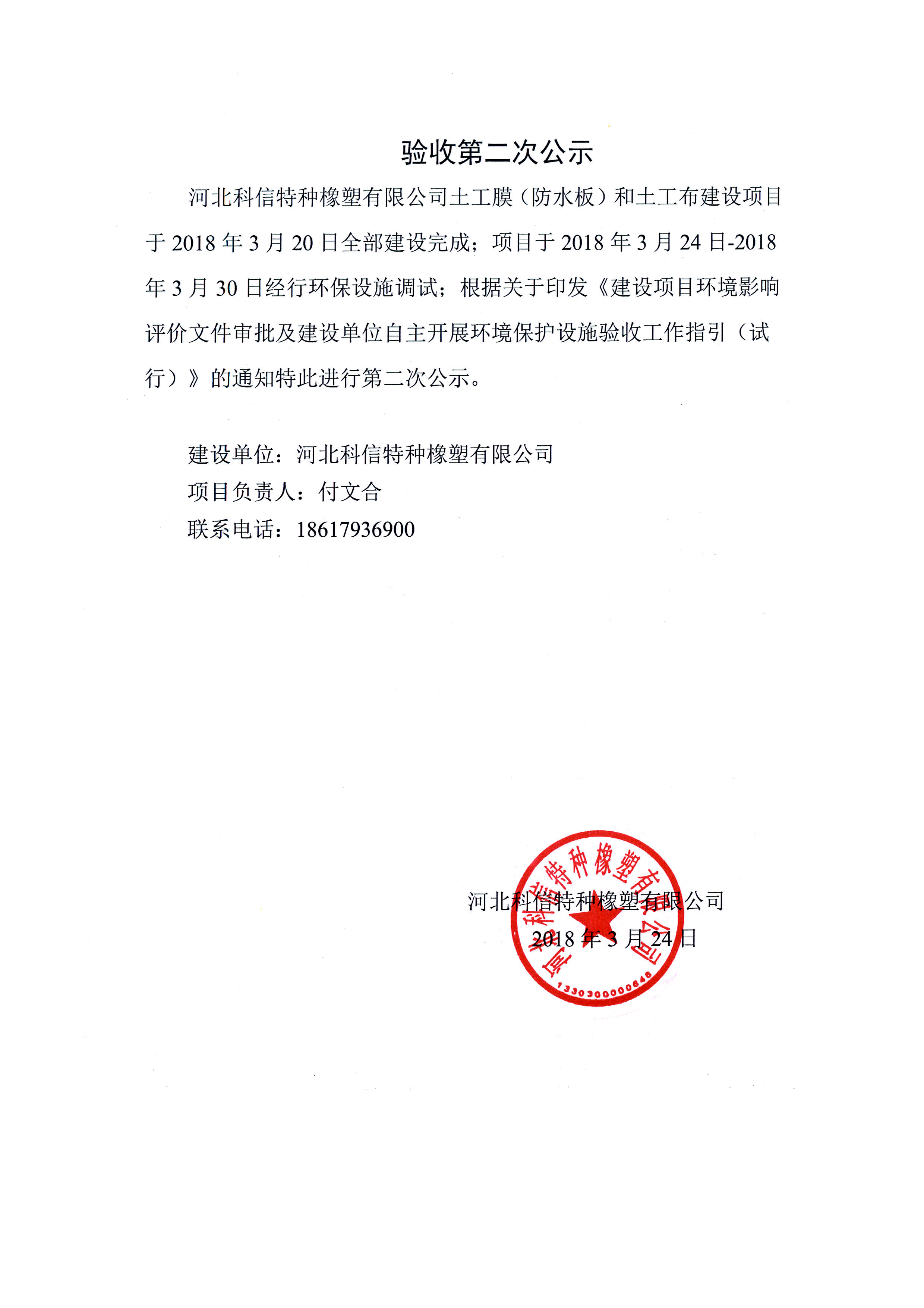 河北科信特種橡塑有限公司土工膜(防水板)和土工布建設(shè)項目于2018年3月20日全部建設(shè)完成;項目于2018年3月24日-2018年3月30日經(jīng)行環(huán)保設(shè)施調(diào)試;根據(jù)關(guān)于印發(fā)《建設(shè)項目環(huán)境影響評價文件審批及建設(shè)單位自主開展環(huán)境保護設(shè)施驗收工作指引(試行)》的通知特此進行第二次公示。